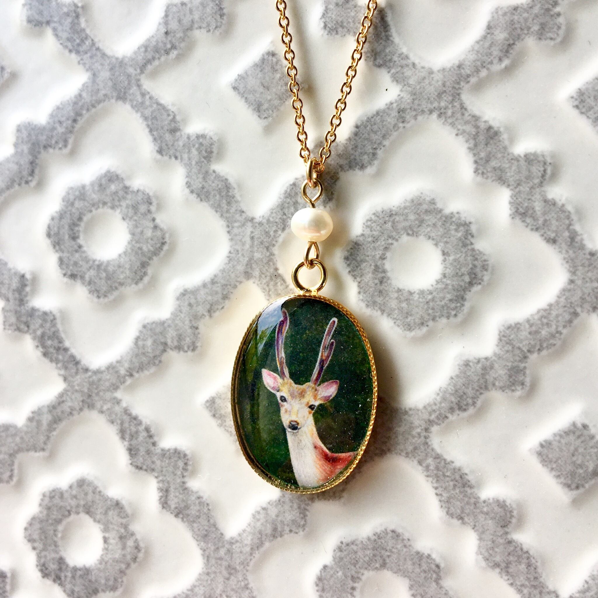 屋久島で出会ったかわいいヤクシカさんのネックレス。背景のグリーン部分は、屋久島の森の写真を使用しているので、深い綺麗なグリーンが印象的です。凛とした雰囲気でオトナな素敵な雰囲気で楽しんでいただけます。