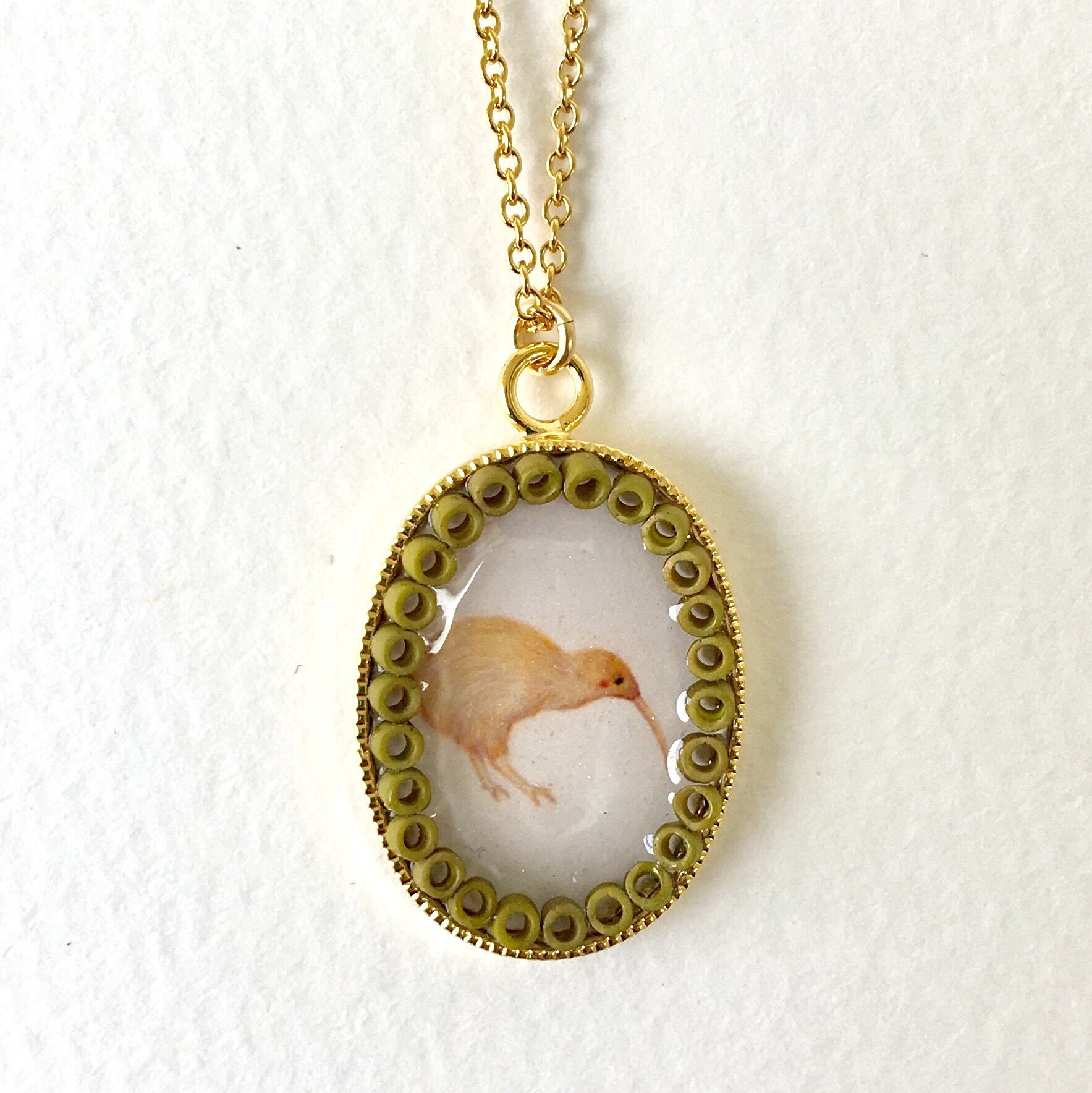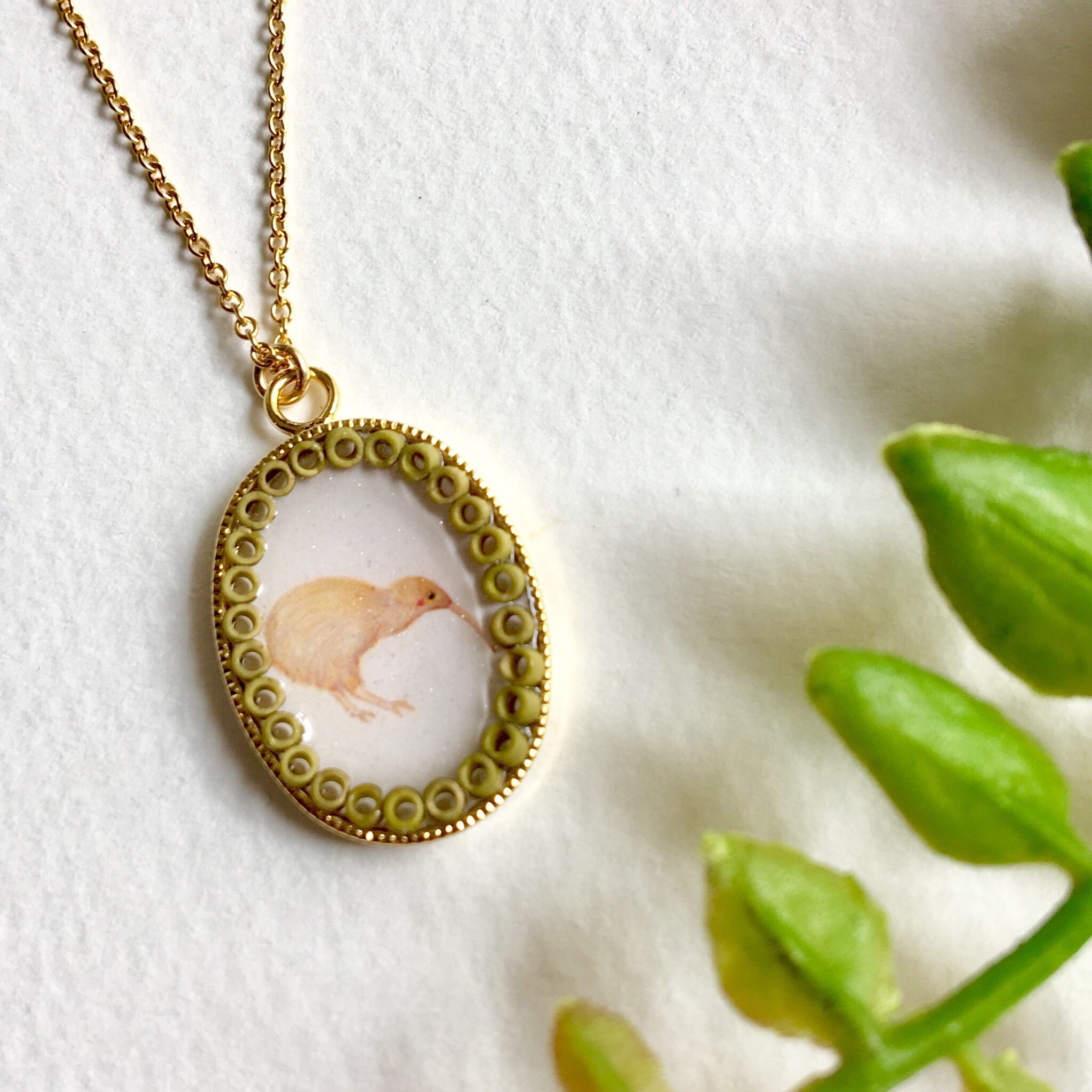 果物のキウイに似ていることからそう名付けられたとか。イラストの周りはガラスのビーズをあしらっているので、絵画のように楽しんでいただける一品です。