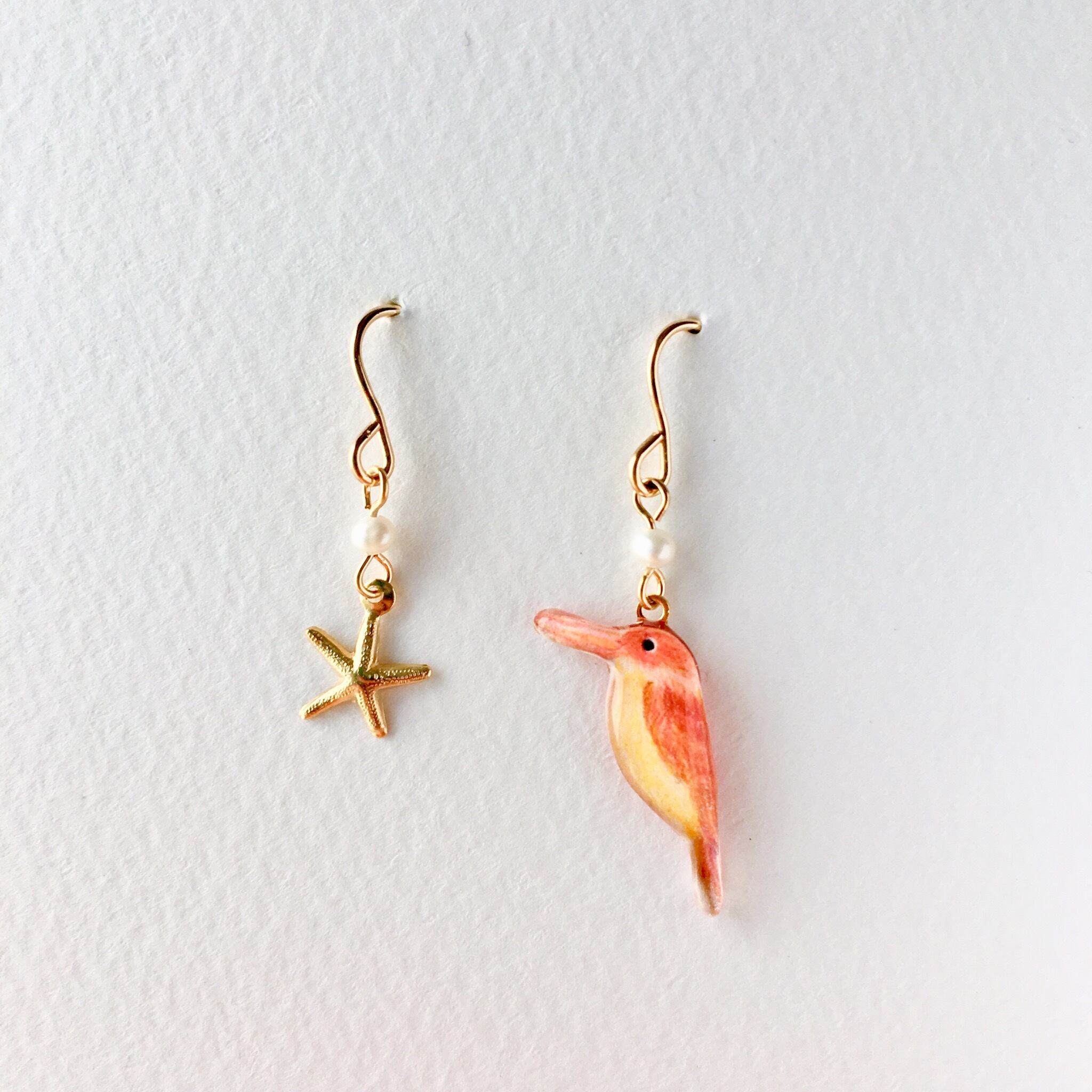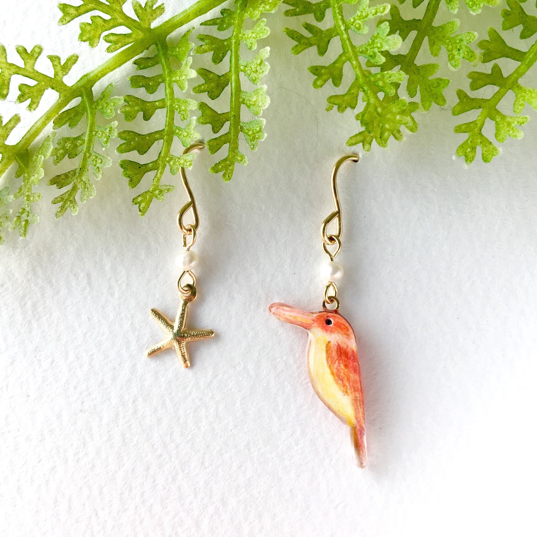 カワセミ科の鳥アカショウビンさんのパールつきアクセサリーです。小ぶりなのでつけやすいです。