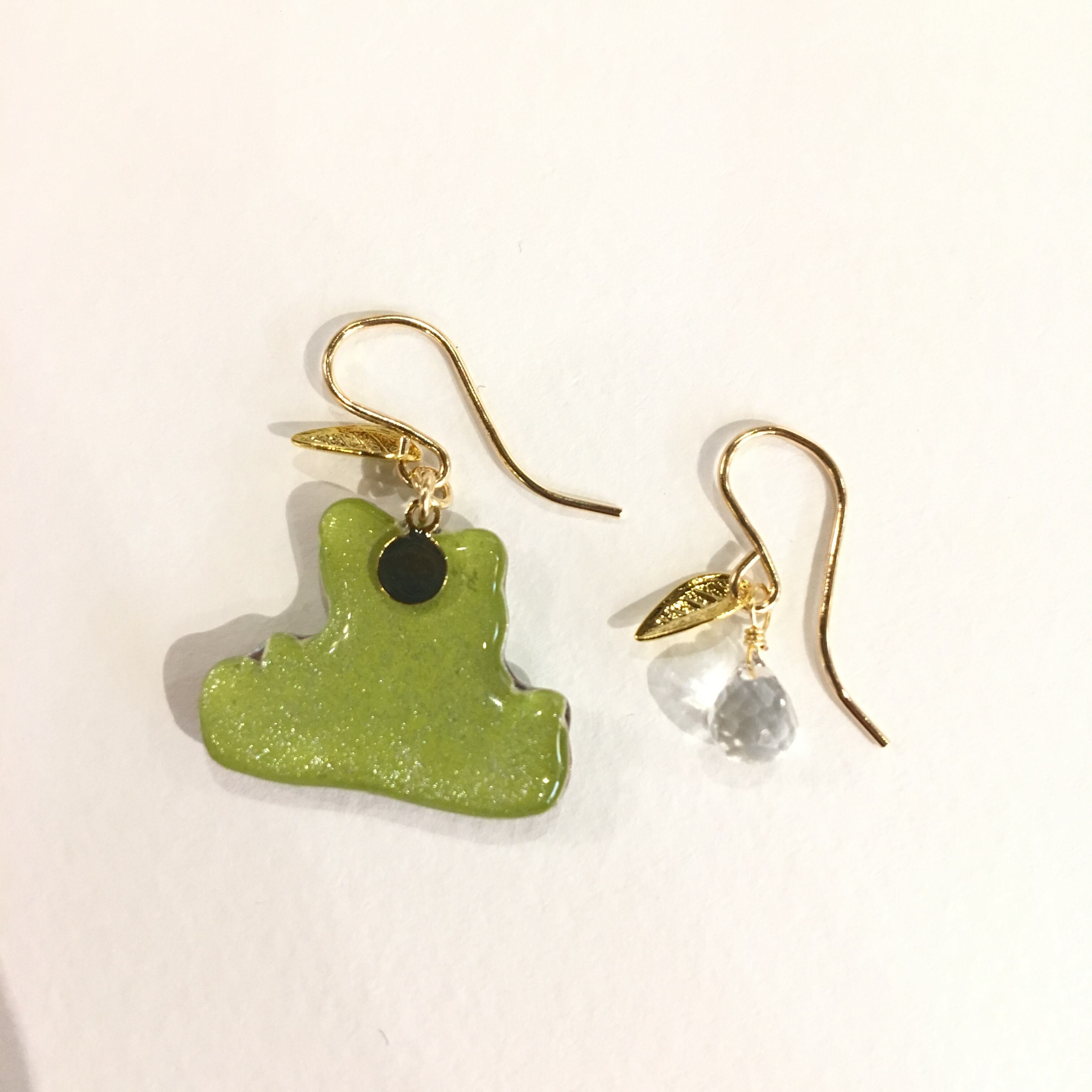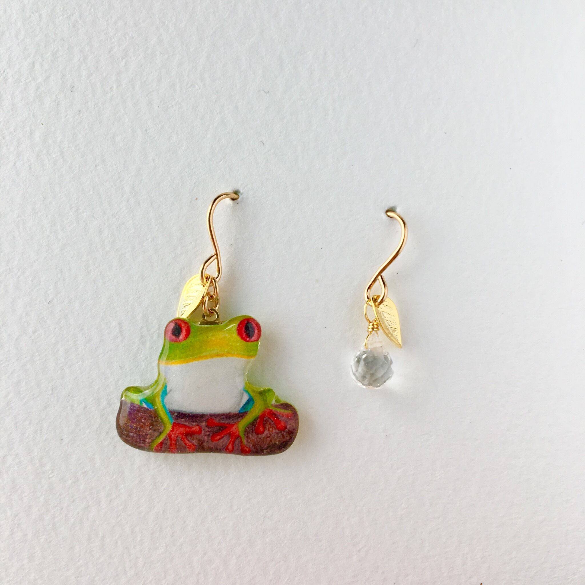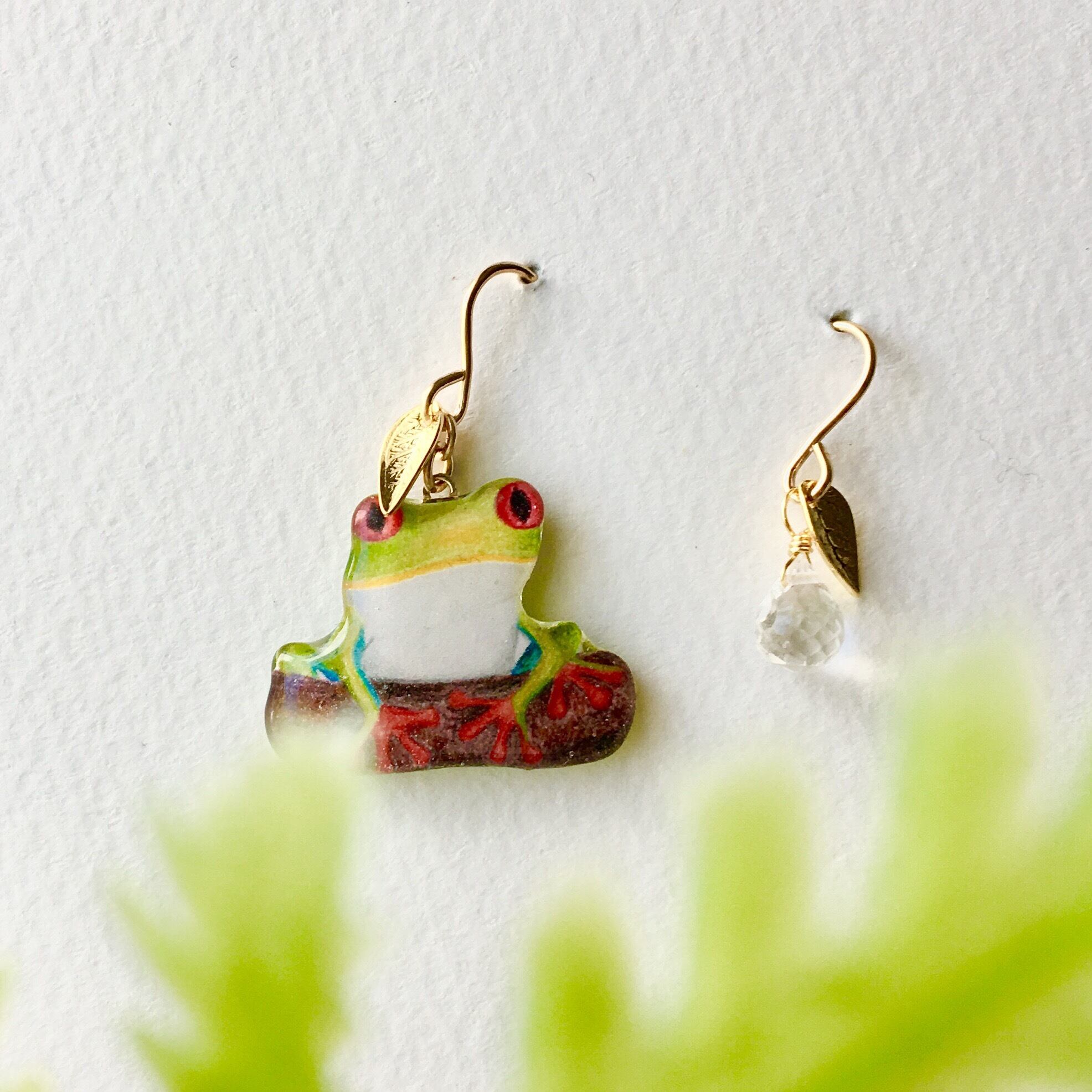 アカメアマガエルさんのアシンメトリーがかわいいアクセサリーです。片側には雨粒のようなクリスタルが付いています。