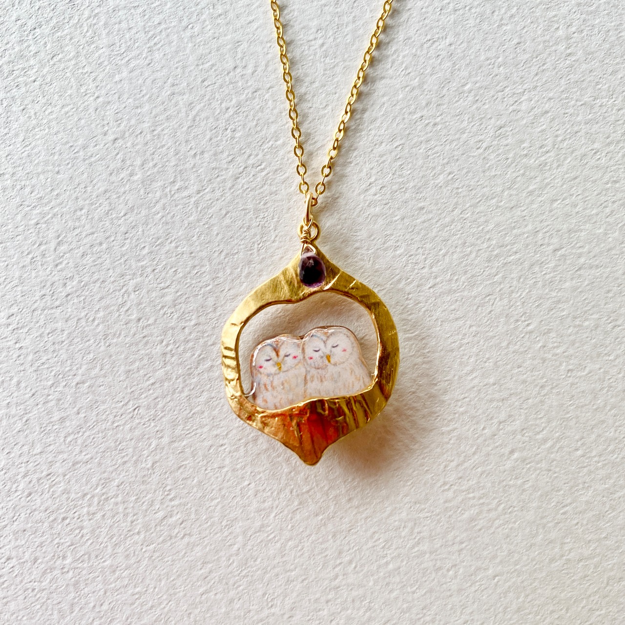 木の中でスヤスヤ眠るエゾフクロウさん。天然石のブルートパーズがキラキラ光って素敵です。