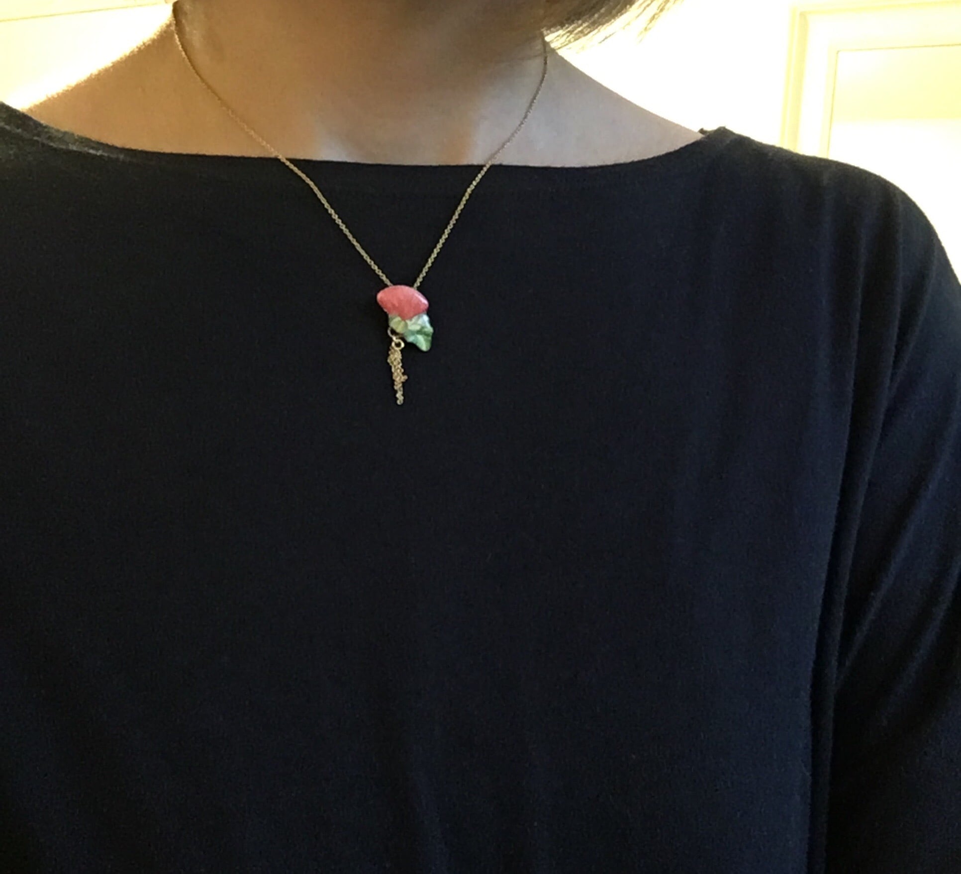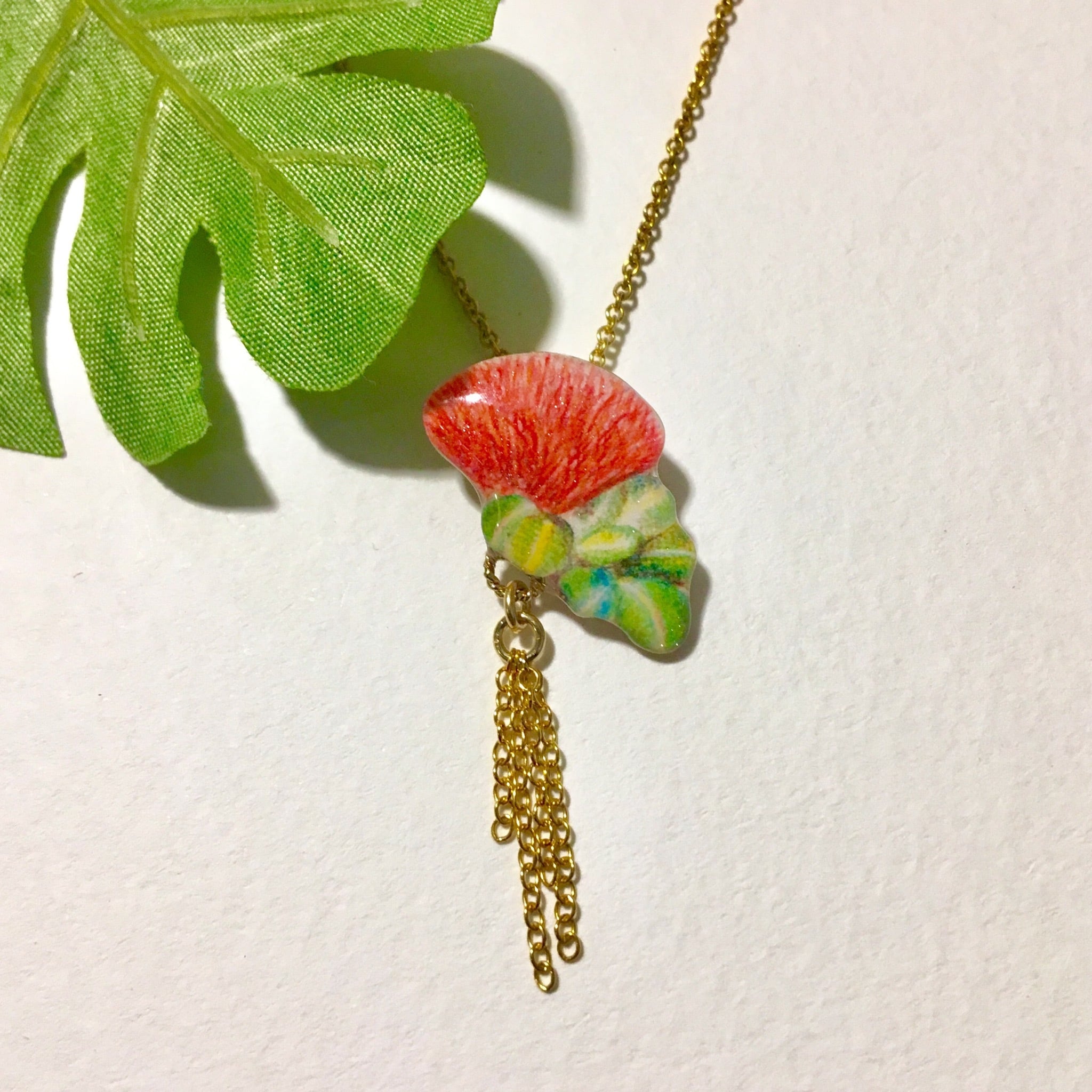外来種の植物に絡みつかれて苦しそうなオヒアレフアの姿もいくつかみました。そんな中でもたくましく生きるオヒアレフアを表現したアクセサリーです。