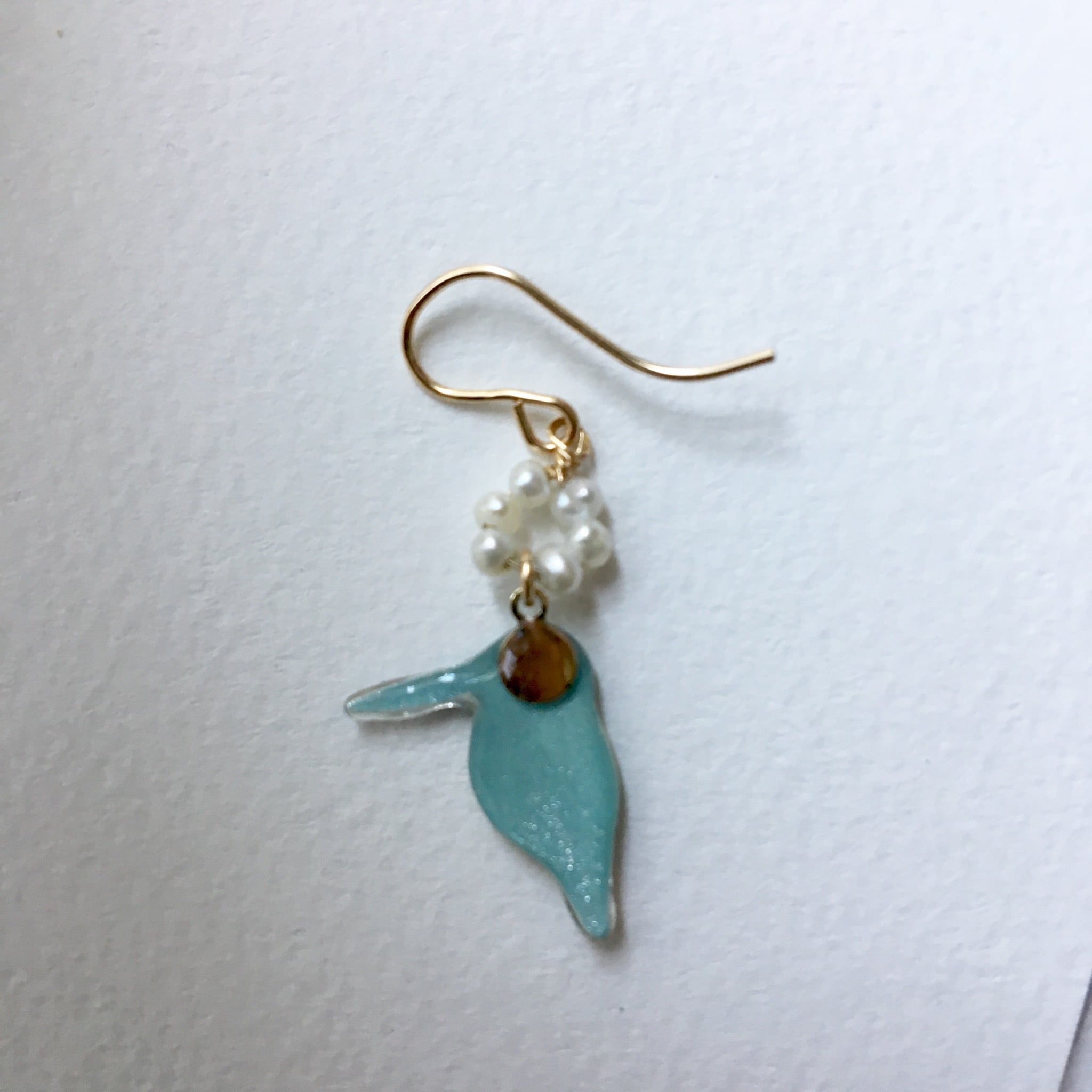 お客様より、静岡市の鳥がカワセミなんです!とご要望いただきまして制作いたしました。カワセミさんの淡水パール付きピアスです。