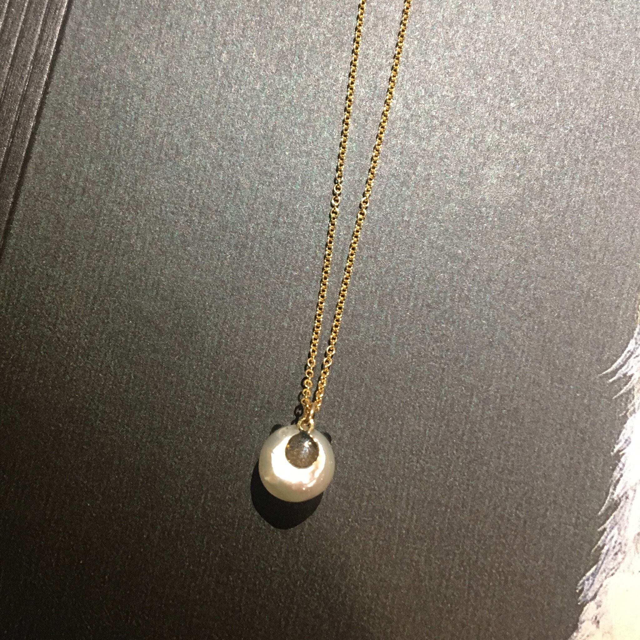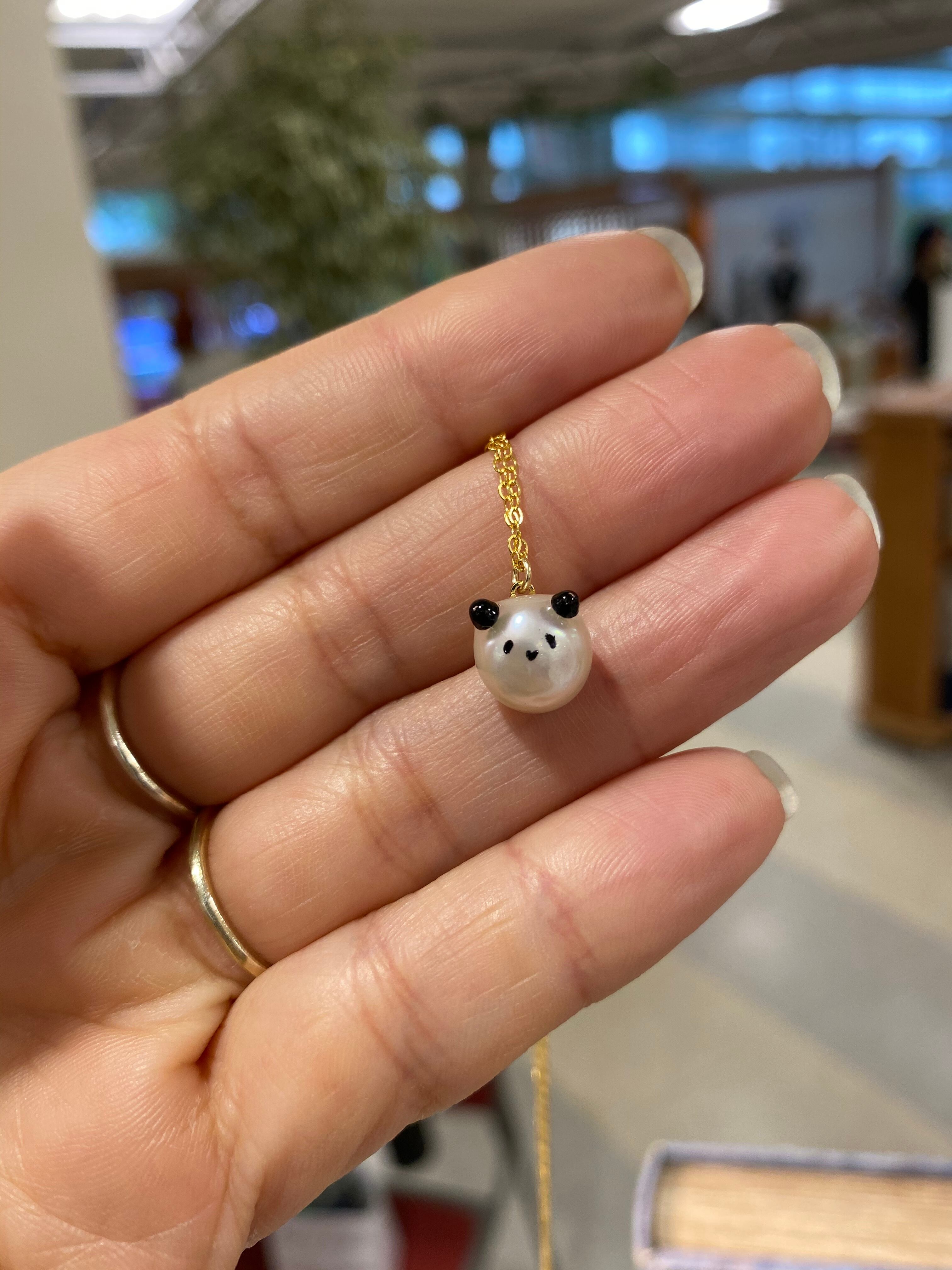 淡水パールにパンダの顔を描いて樹脂でコーティンぐしているネックレスです。