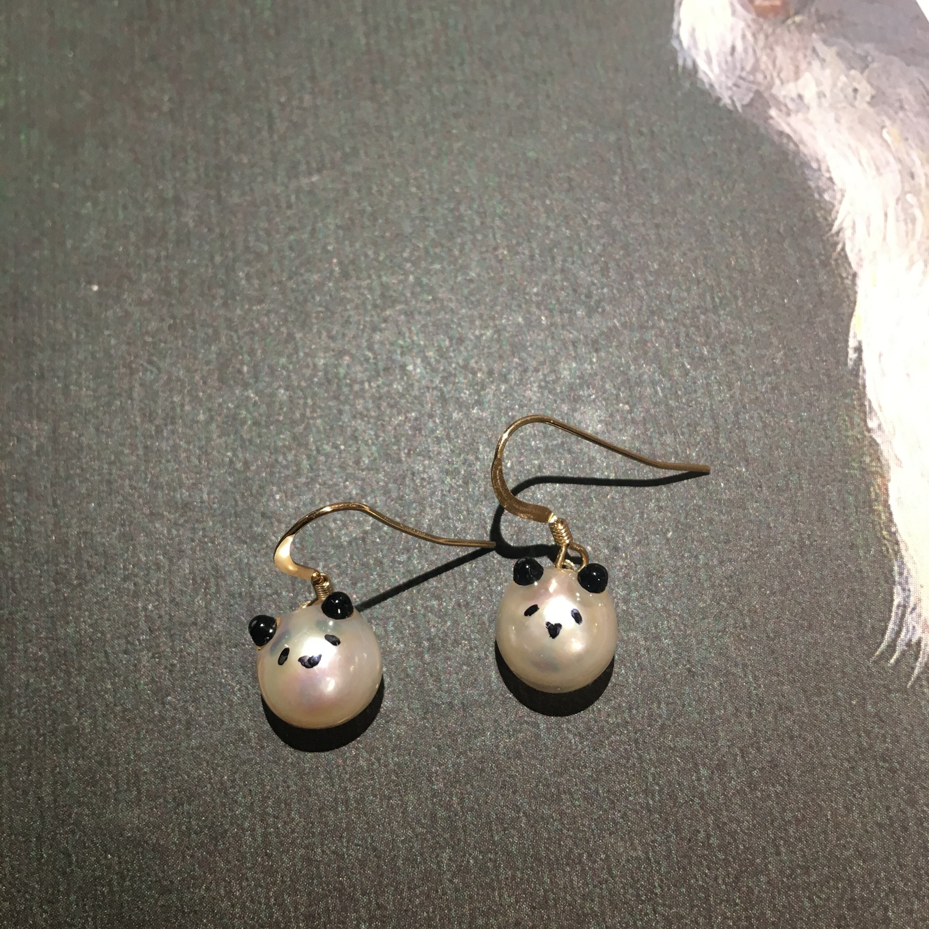 淡水パールにパンダの顔を描いて樹脂でコーティンぐしているピアスです。