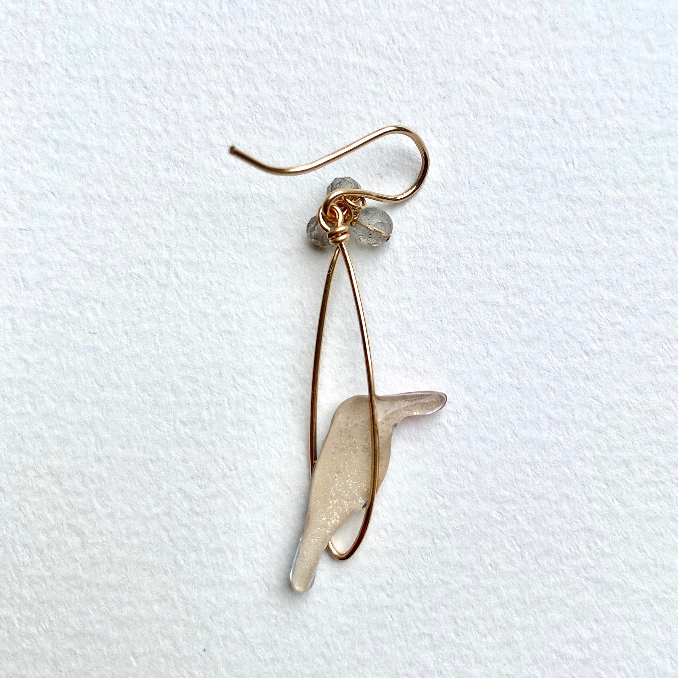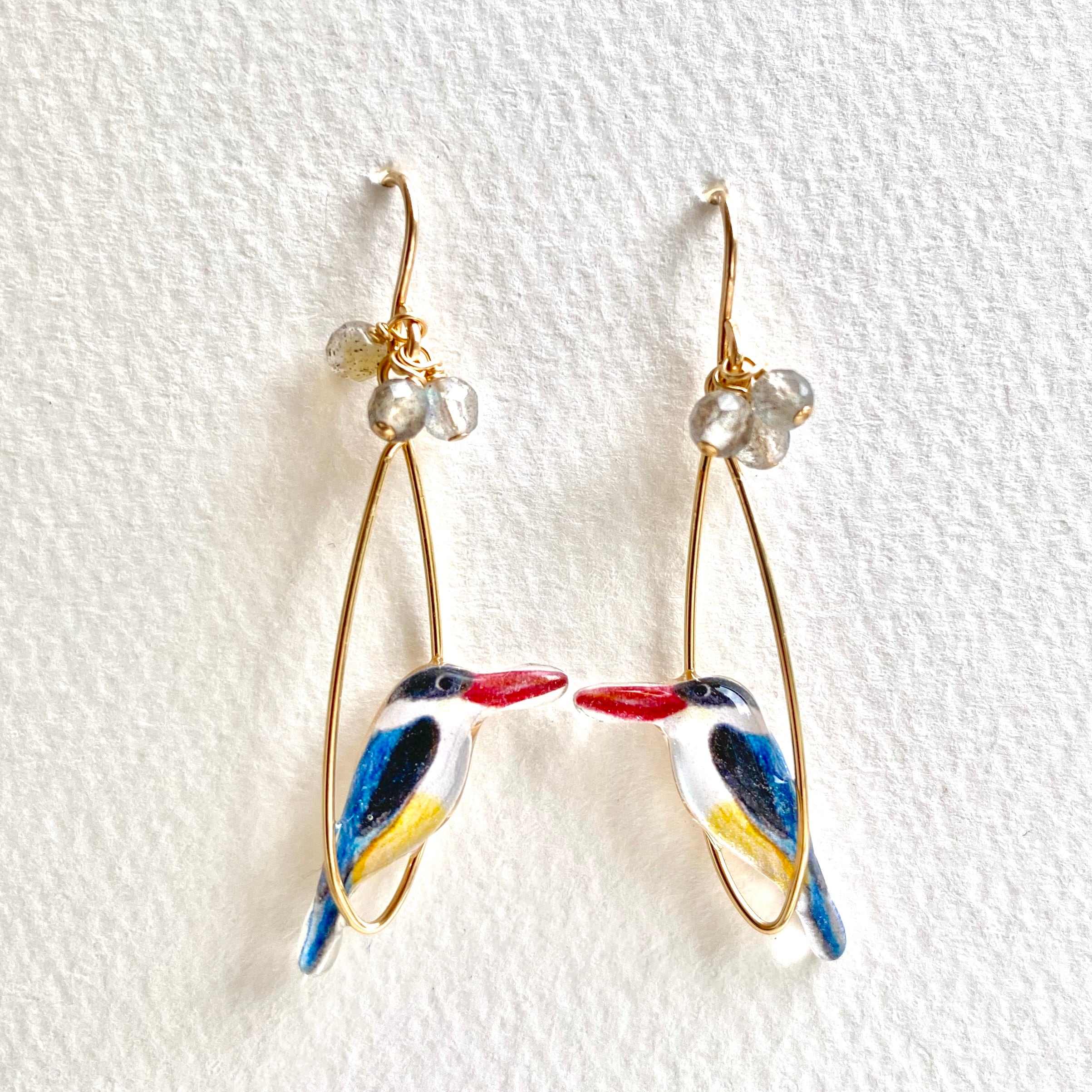 カワセミ科のヤマショウビンさんの小ぶりサイズバージョンです。天然石のラブラドライト付きでさりげなく大人っぽくお使いいただけます。