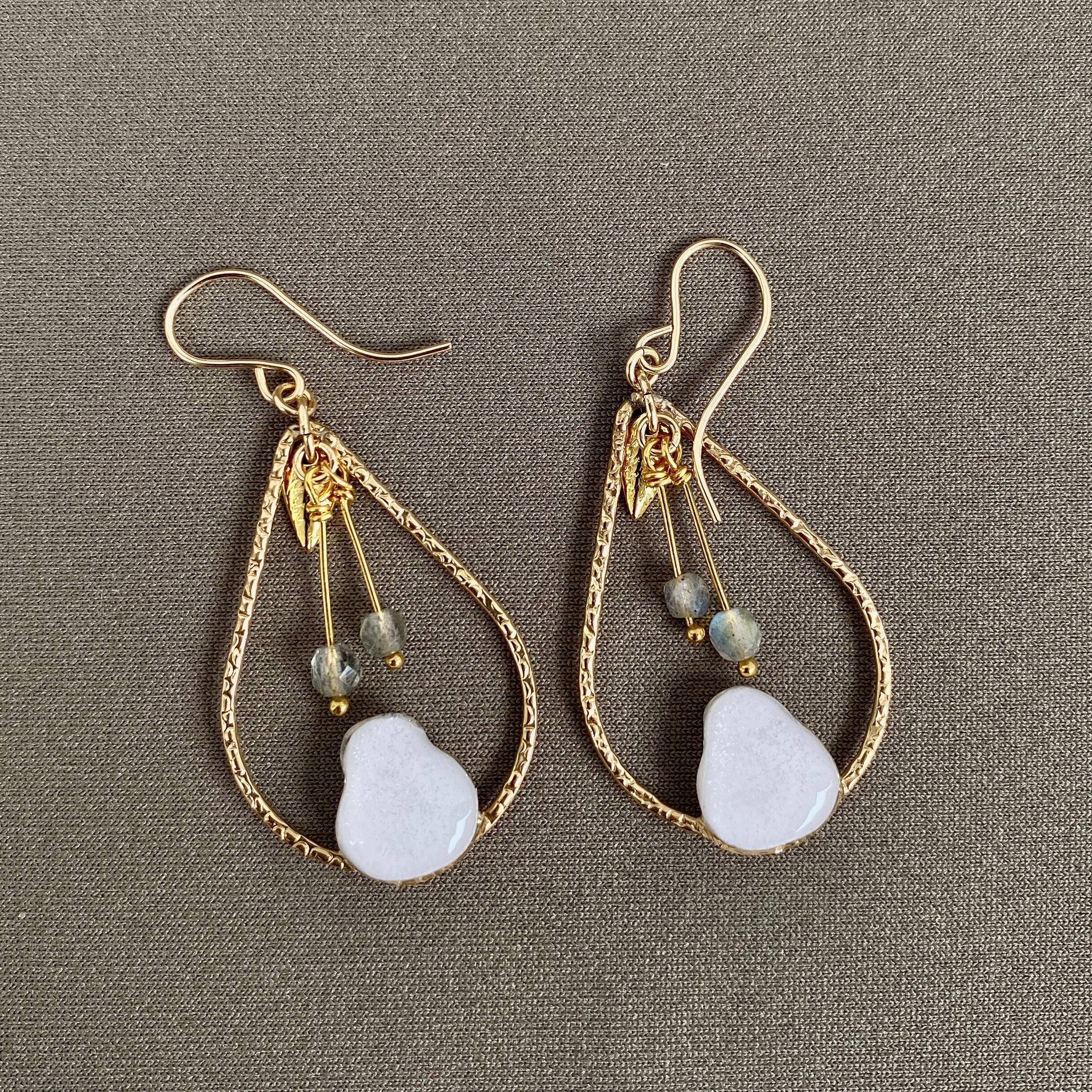 北海道にすむ、雪の妖精と言われている、シマエナガさんのかわいいピアスです。雪をイメージした天然石ラブラドライトが素敵です。