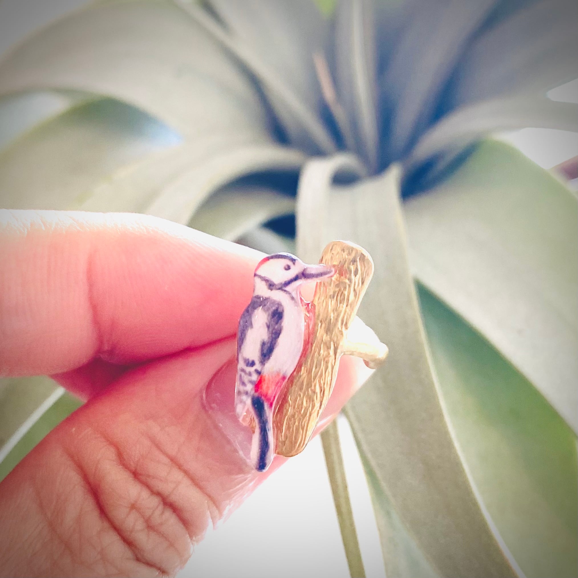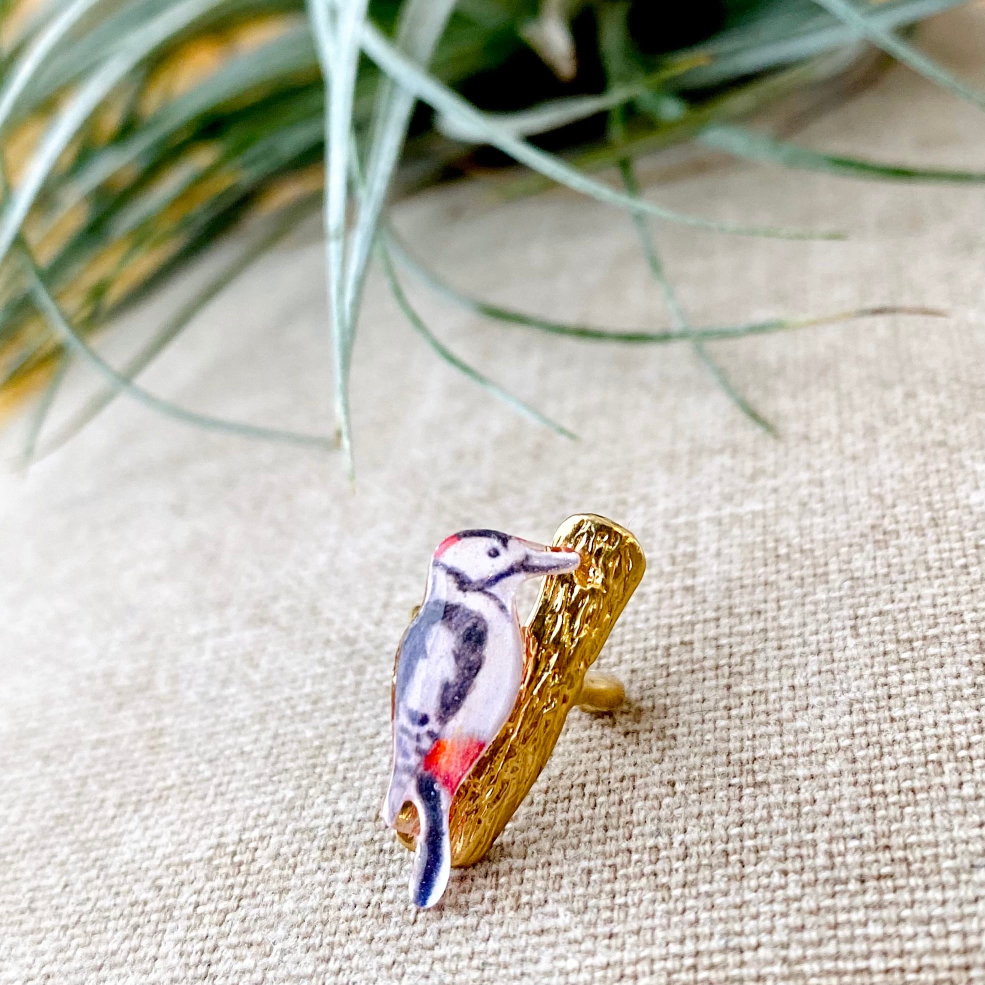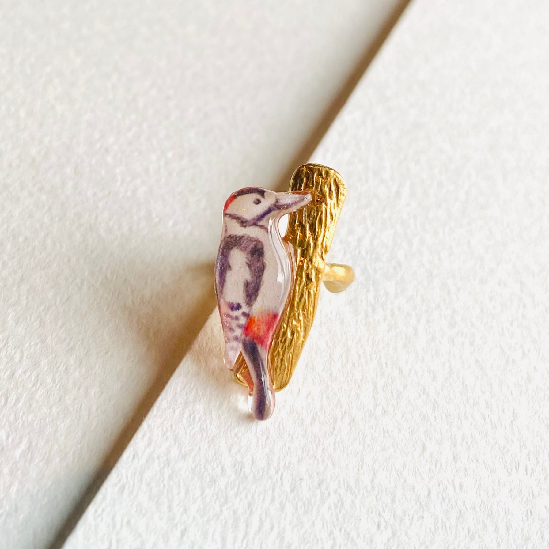 キツツキのアカゲラさん。木をつついているアカゲラさんをモチーフにしたイヤーカフです。