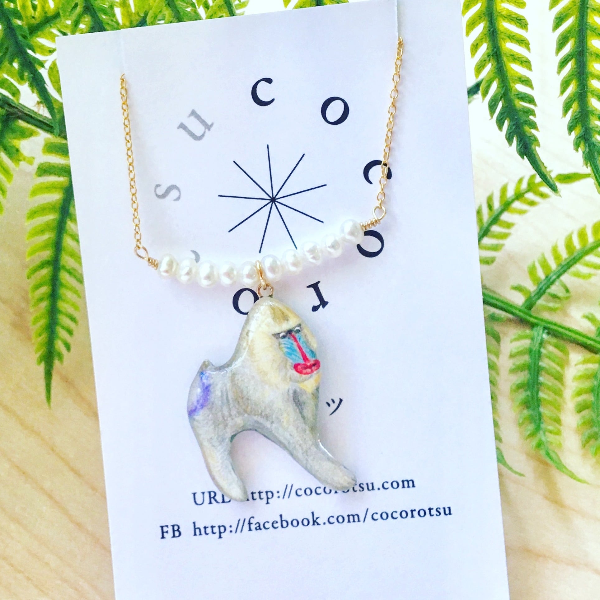 アフリカガボン共和国で見てきたマンドリルをイロエンピツで描き樹脂でコーティングいたしました。淡水パール付きで、マニアックだけど(笑)チョットエレガントなかわい一品です。