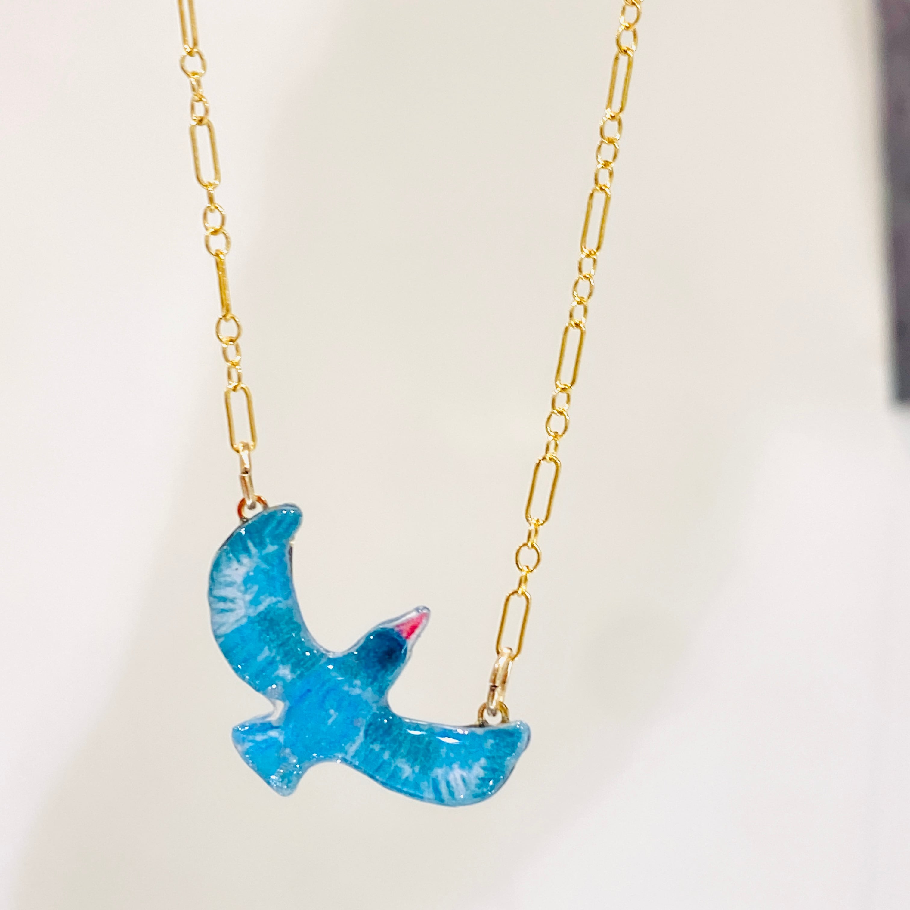 バリで出会ったカワセミ科の鳥ジャワショウビン。羽を広げた際の青色がとても美しく、その様子をアクセサリーにいたしました。