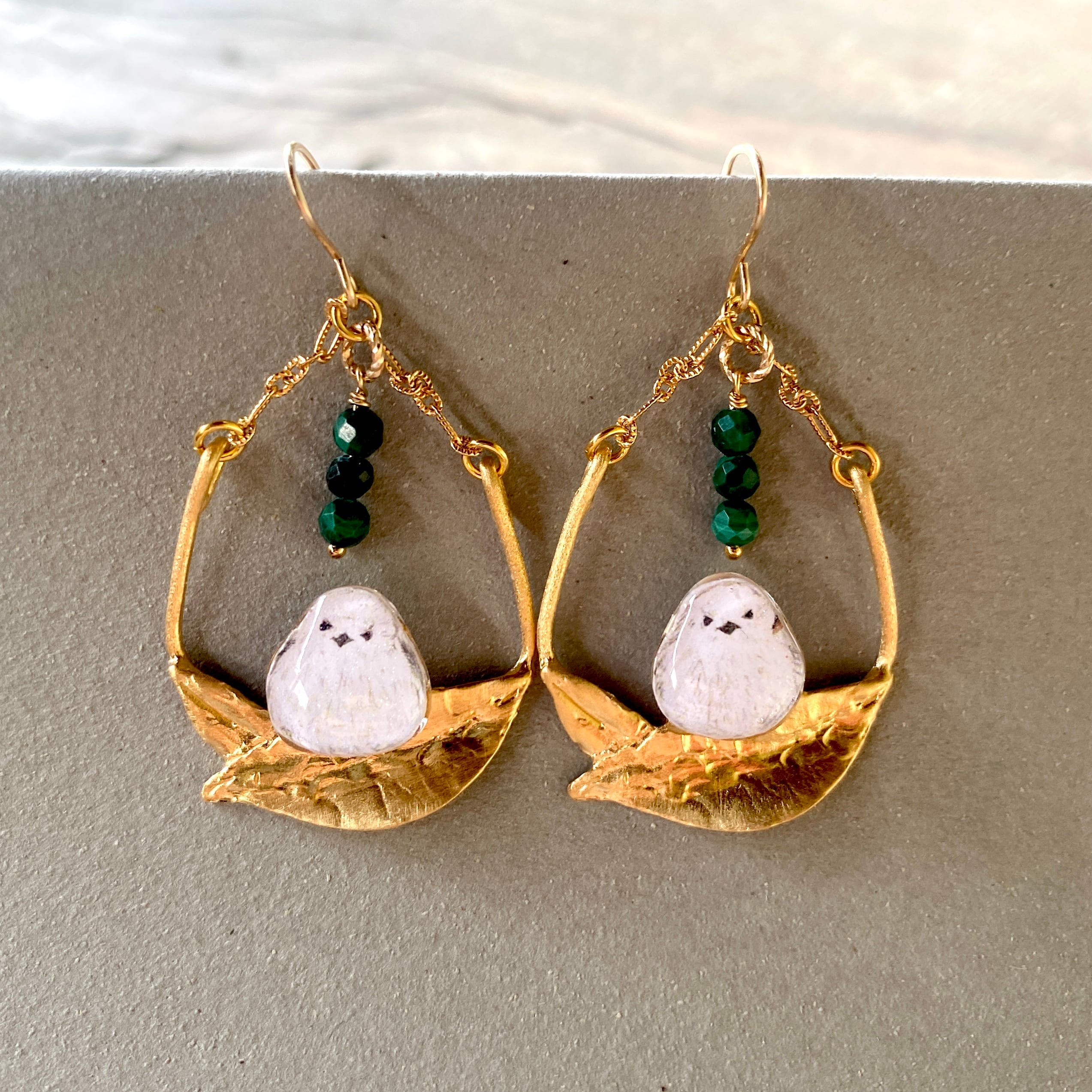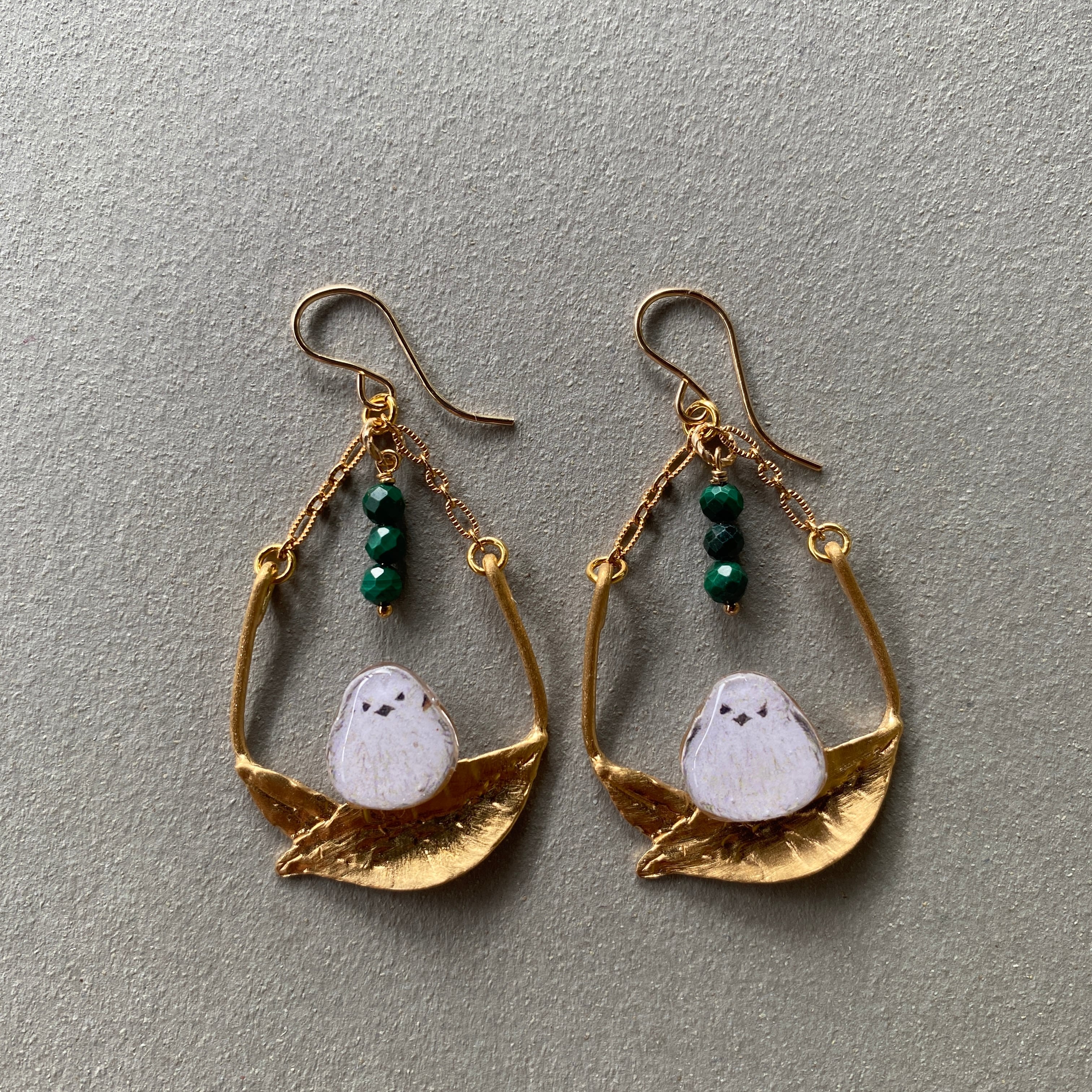 北海道の人気者、モフモフかわいいスズメ科の鳥シマエナガちゃんが木の葉に乗ったアクセサリー。存在感もあり大人可愛く装える一品です。